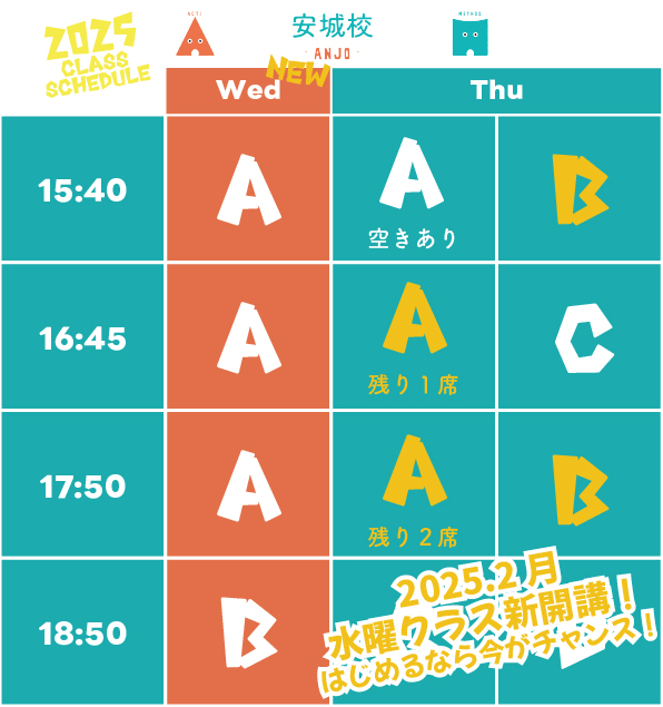 2025.2月より安城校水曜クラスの新開講が決定! 曜日を増やしたばかりでお席のある今が入会のチャンス!