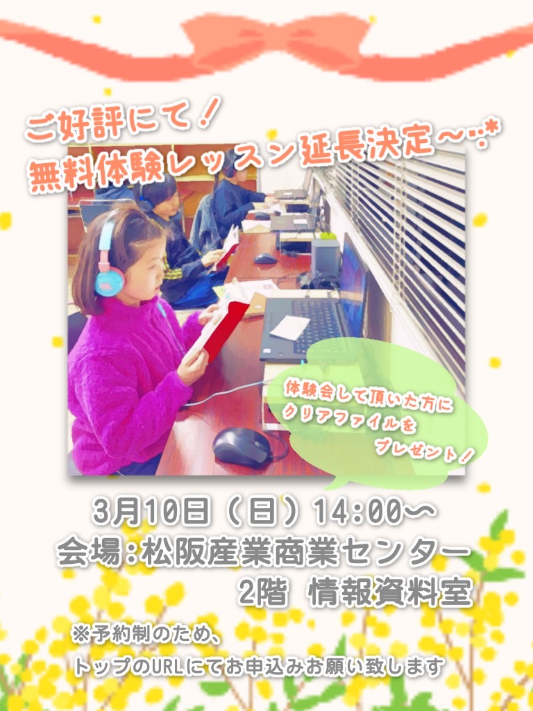 ご好評につき、「無料体験レッスン」を3月も開催することになりました✨ 英語×タイピングってなんだろう? どんなレッスンなんだろう? すべて体験会でご説明させていただきます😌 もちろん、実際にパソコンに触れて […]